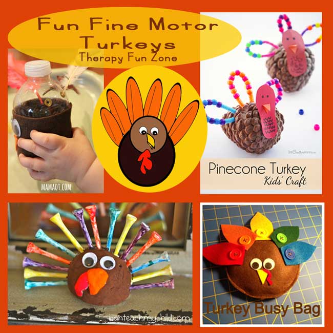Mama OT has a really cute bottle turkey that works on fine motor skills by putting feathers into holes. Go check it out at MamaOT.